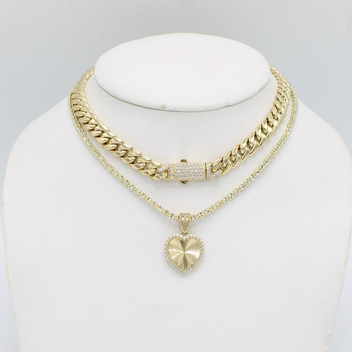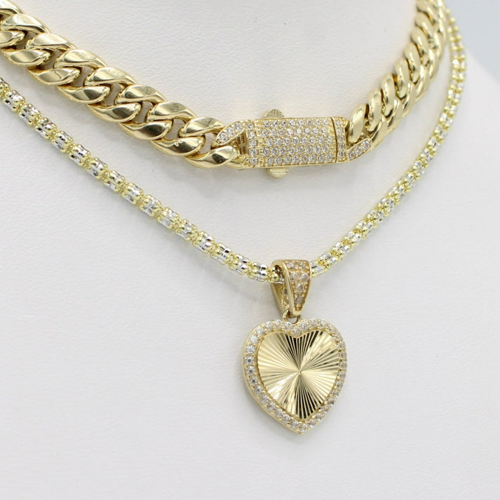 14K Cuban Choker with Heart Pendant Cz Stones with Ice Chain Yellow Gold
